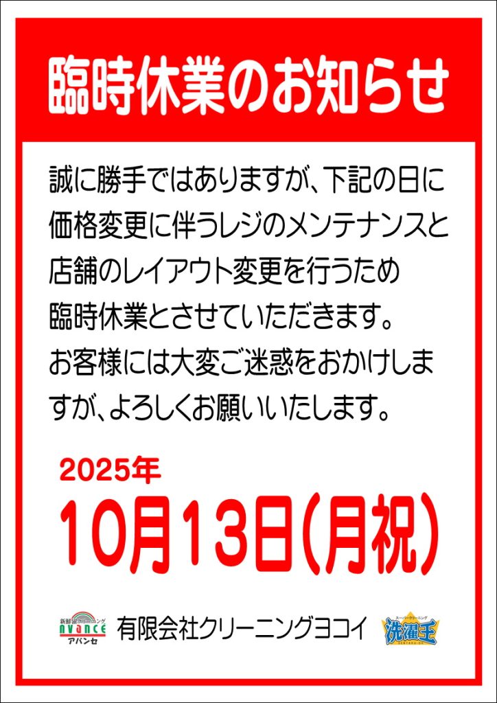 臨時休業のお知らせ